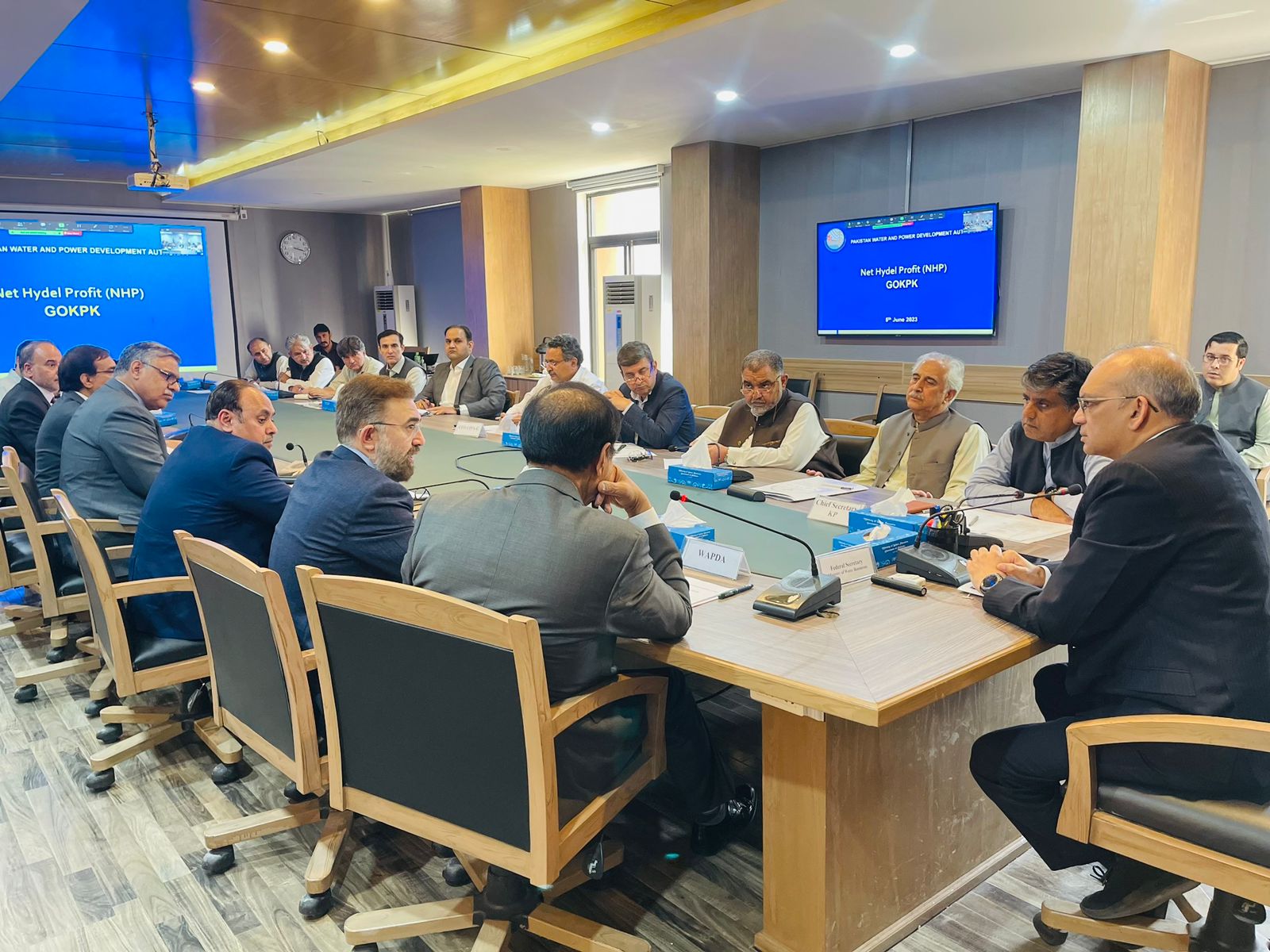 Secretary Water Resources chaired a meeting on "Net Hydel Profit (NHP) Payable to Govt of Khyber Pakhtunkhawa" on 05-06-23. Advisor to CM KPK, Chief Secretary KPK, Chairman WAPDA, Joint Secretary (Water), and relevant officials were also present in the meeting.
