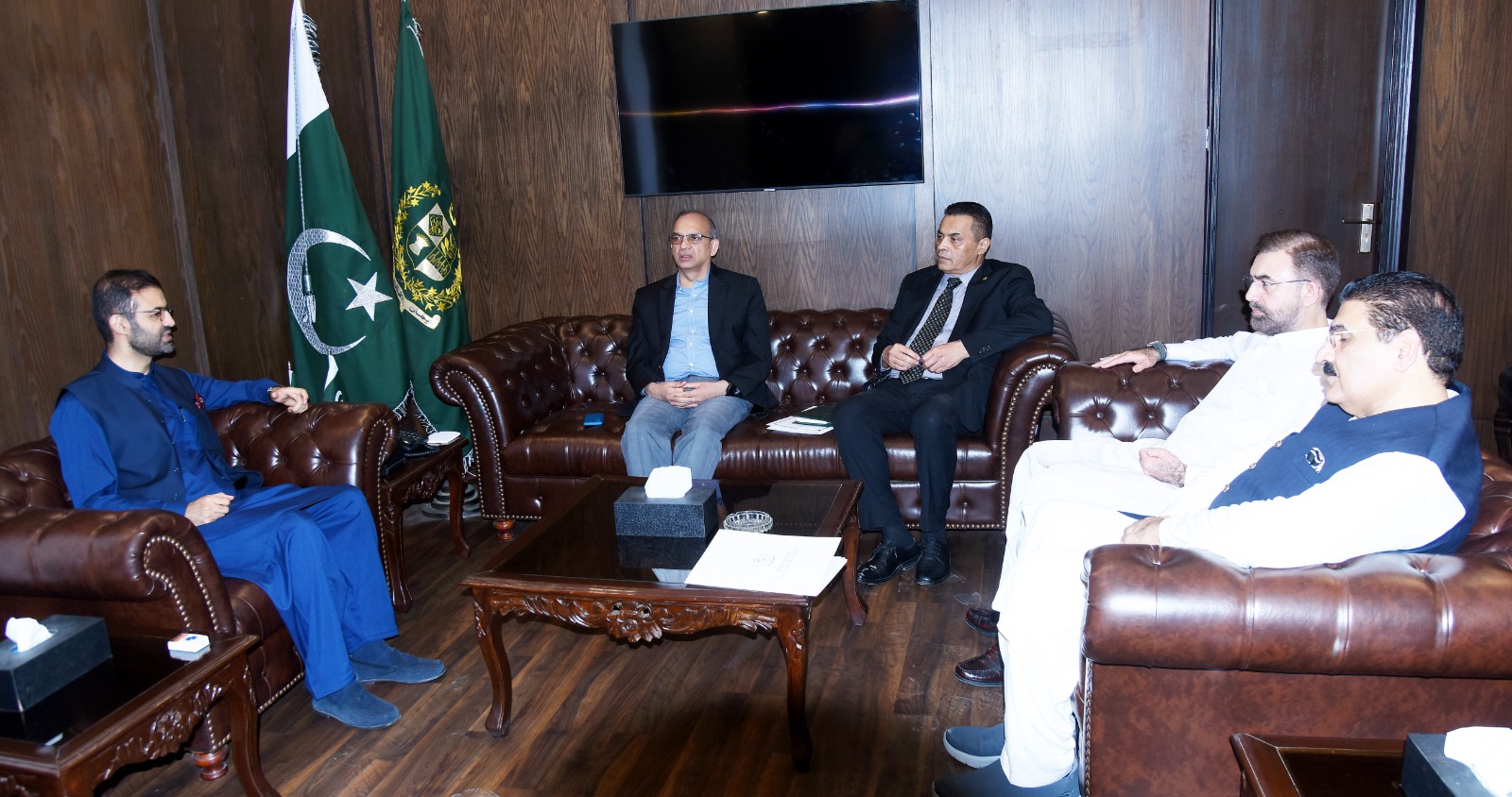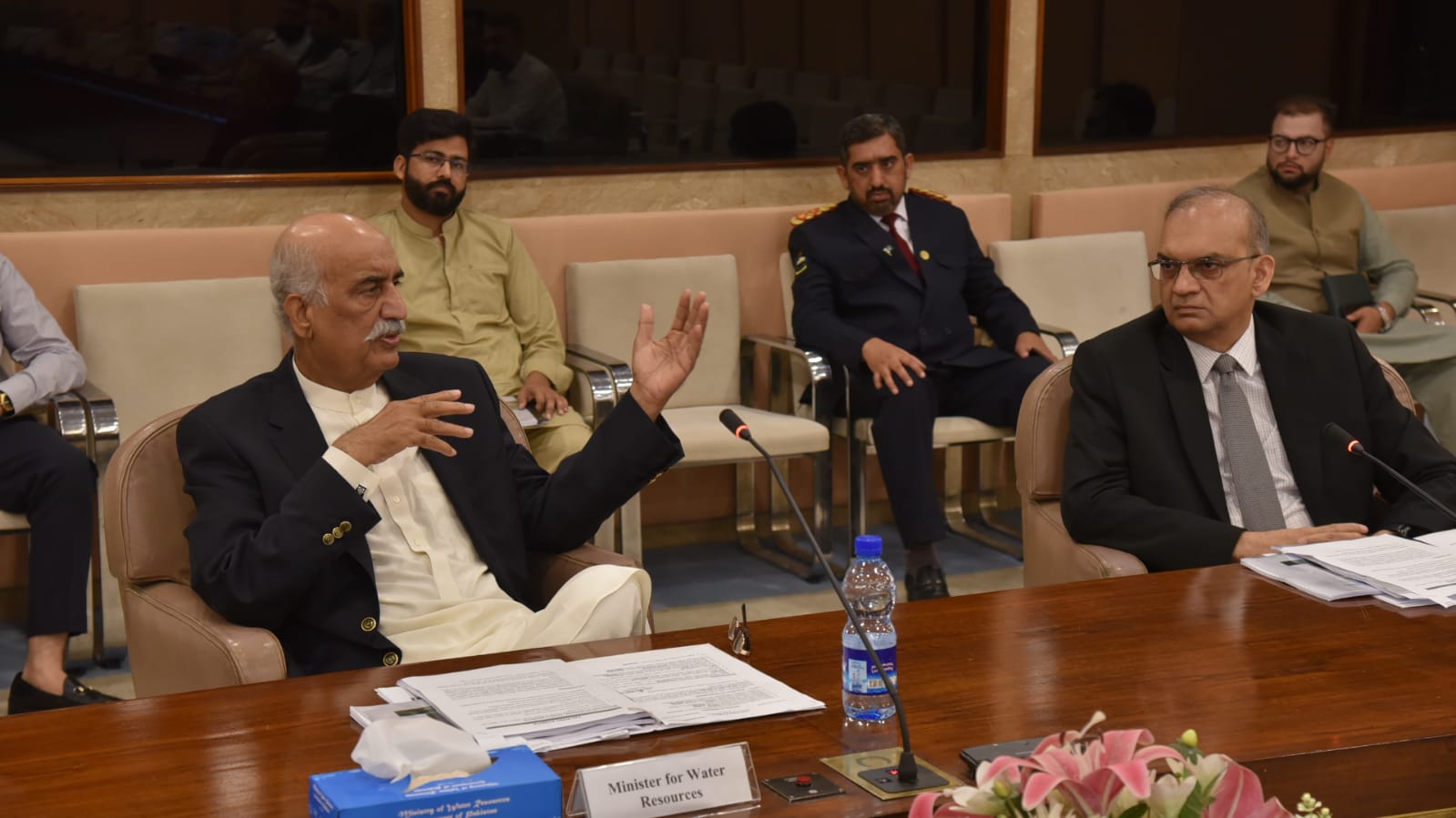 Caretaker Federal Minister for Water Resources Ahmad Irfan Aslam and Caretaker Federal Minister for Interior Sarfraz Bughti chairing a meeting regarding the restoration of Kachi Canal project on 11-09-23.